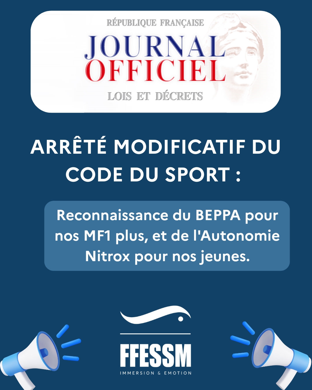 Nous attendions depuis 1 an cette modification des annexes du Code du Sport (annexes III 15a et 15b) pour qu'il y soit intégré la mention du BEPPA. Un dossier parfaitement cadré par notre Commission Technique Nationale, avec une volonté politique très forte et une promesse depuis 2022. Un délai d'attente en 2025 lié au renouveau complet de la filière professionnelle sportive depuis plus d'un an, celle-ci occupant tout le champ de la réglementation et de la formation a retardé cette publication. Le BEPPA, prévu pour nos "MF1 plus" ayant réussi un complément de formation fédérale, est ainsi inscrit sur la qualification minimale du DP en milieu naturel pour le Trimix et sur la qualification minimale de la personne encadrant la palanquée reconnue comme E4 (enseignent niveau 4).
