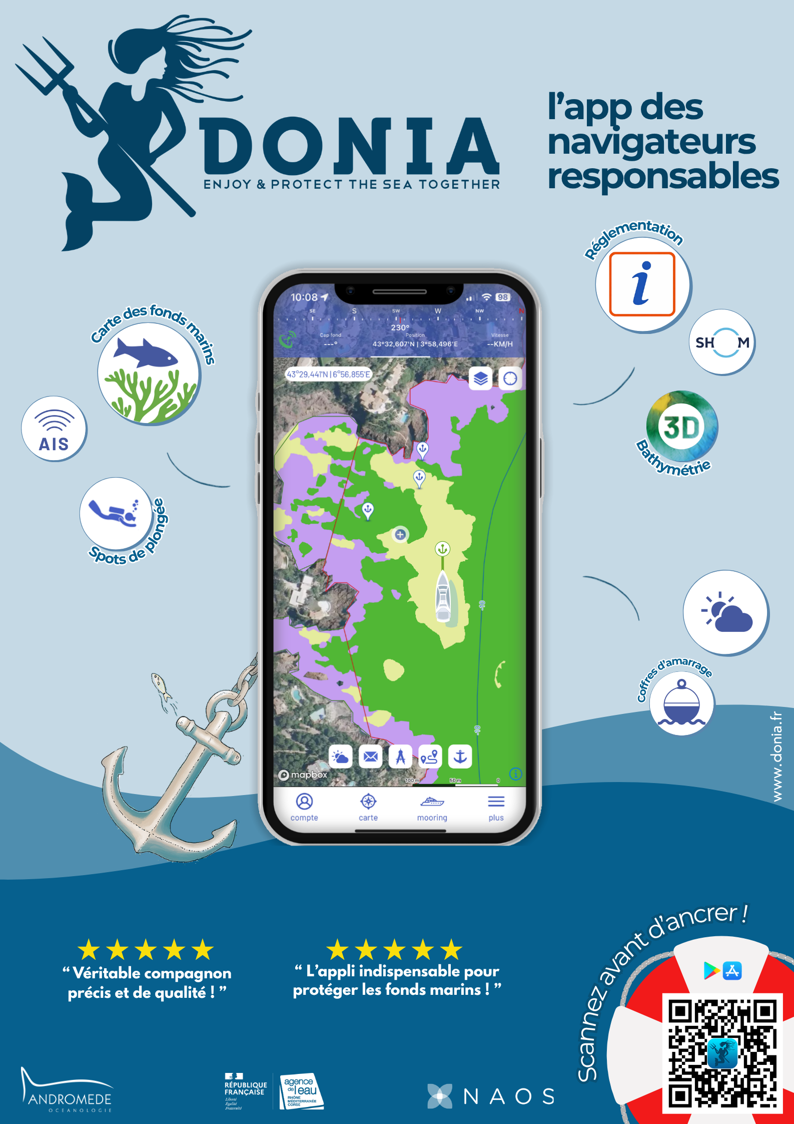 Développée par Andromède Océanologie, DONIA est une application communautaire de navigation et d'aide à l'ancrage conçue spécifiquement pour la Méditerranée. Son objectif : protéger les herbiers de posidonie — poumon de notre mer intérieure, classés espèce protégée — en guidant plaisanciers, plongeurs et pêcheurs vers des zones d'ancrage respectueuses des fonds fragiles.