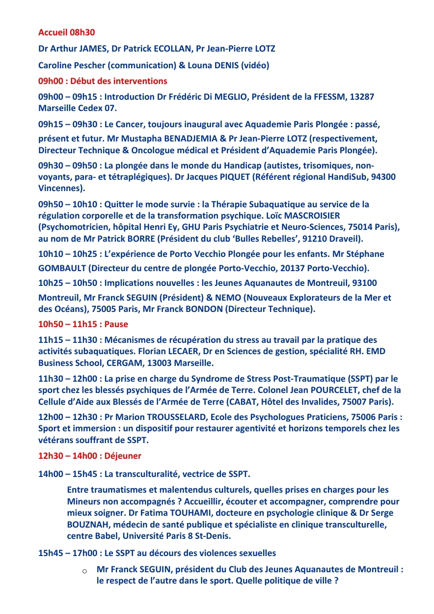 Faisant suite au succès de l'édition 2025, cette journée réunit des experts de l'AP-HP, du monde militaire et de la Fédération. Frédéric Di Meglio, Président de la FFESSM, ouvrira les débats pour réaffirmer le rôle de la « Vitamine Bleue » dans le parcours de soin.