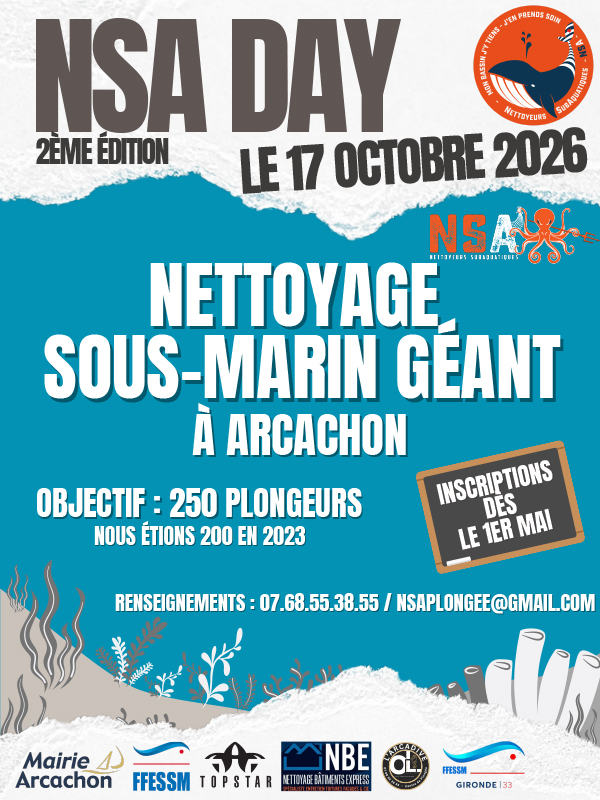 Plus au sud, sur le bassin d’Arcachon, l’association NSA – Nettoyage Sous-marin d’Arcachon prépare un événement environnemental majeur.