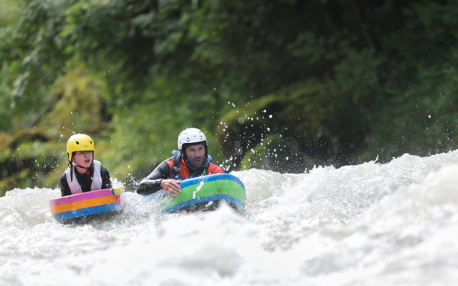 Le nageur en appui sur un flotteur s'élance sur une distance de 5 à 15 km sur une rivière de classe III à IV selon le niveau pour une course contre la montre.