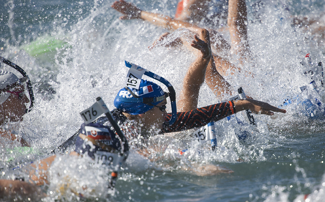Le compétiteur plonge du plot tout équipé (palmes, scaphandre, gilet stabilisateur) pour un sprint de 100m.