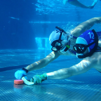 Le hockey subaquatique est un sport d'équipe qui se joue en apnée au fond d'une piscine, avec une crosse et un palet, et deux cages de but posées sur le fond aux extrémités de la piscine.