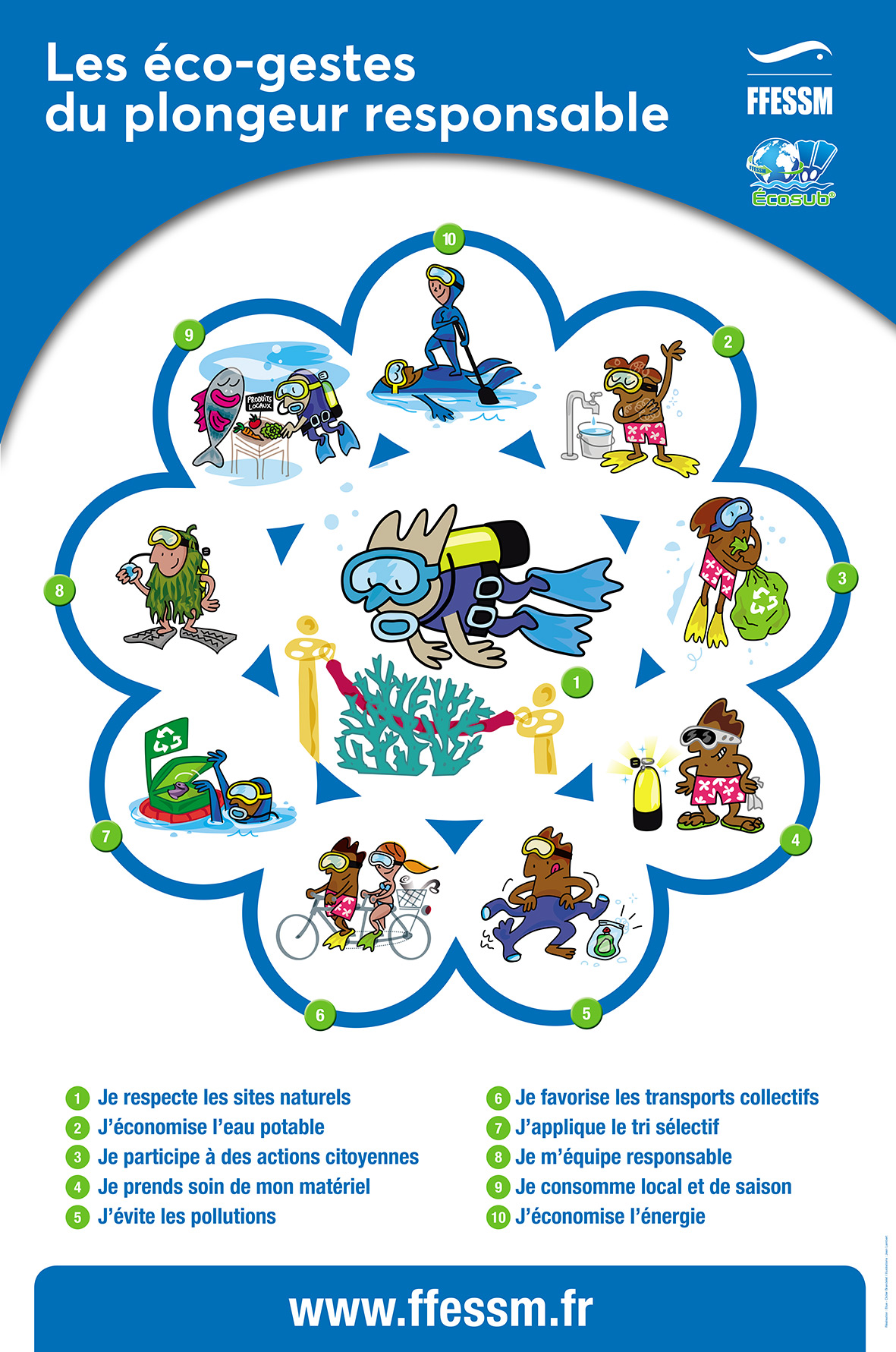 La FFESSM met à votre disposition une affiche et un livret "Les écogestes du plongeur responsable", avec une proposition de 10 écogestes :